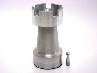 Finally we have the Rook. The Rook here is different from the previous 3 in that it is not produced by aluminium casting but crafted from a solid aluminium block (CNC machining perhaps?); much like the way William Strijbos produces his metal puzzles. Quality and construction here are excellent. The crown portion of the Rook is polished aluminium while the body is ball burnished. Shortest of the 4, it stands at about 3 3/4in tall and 1 /78in across at the base.
