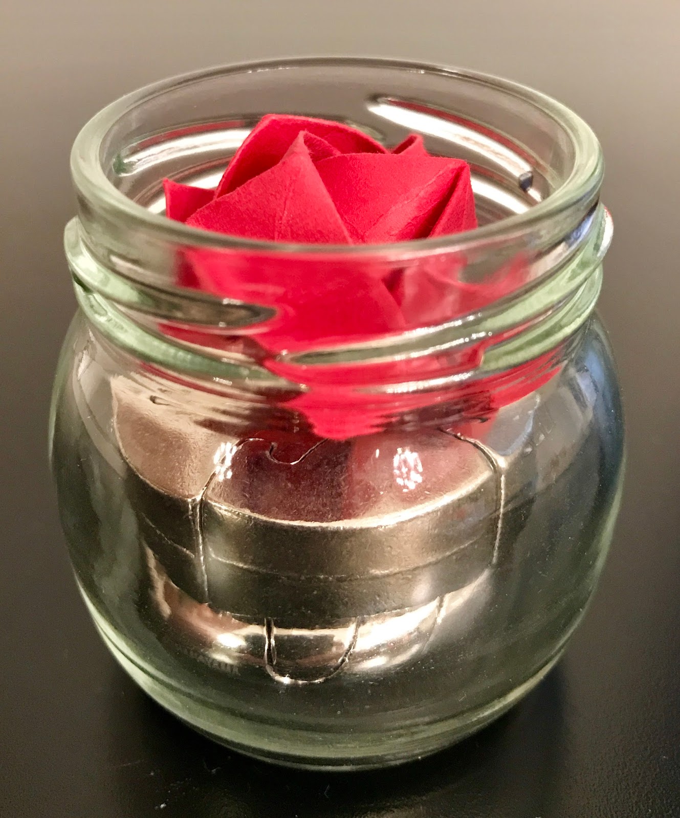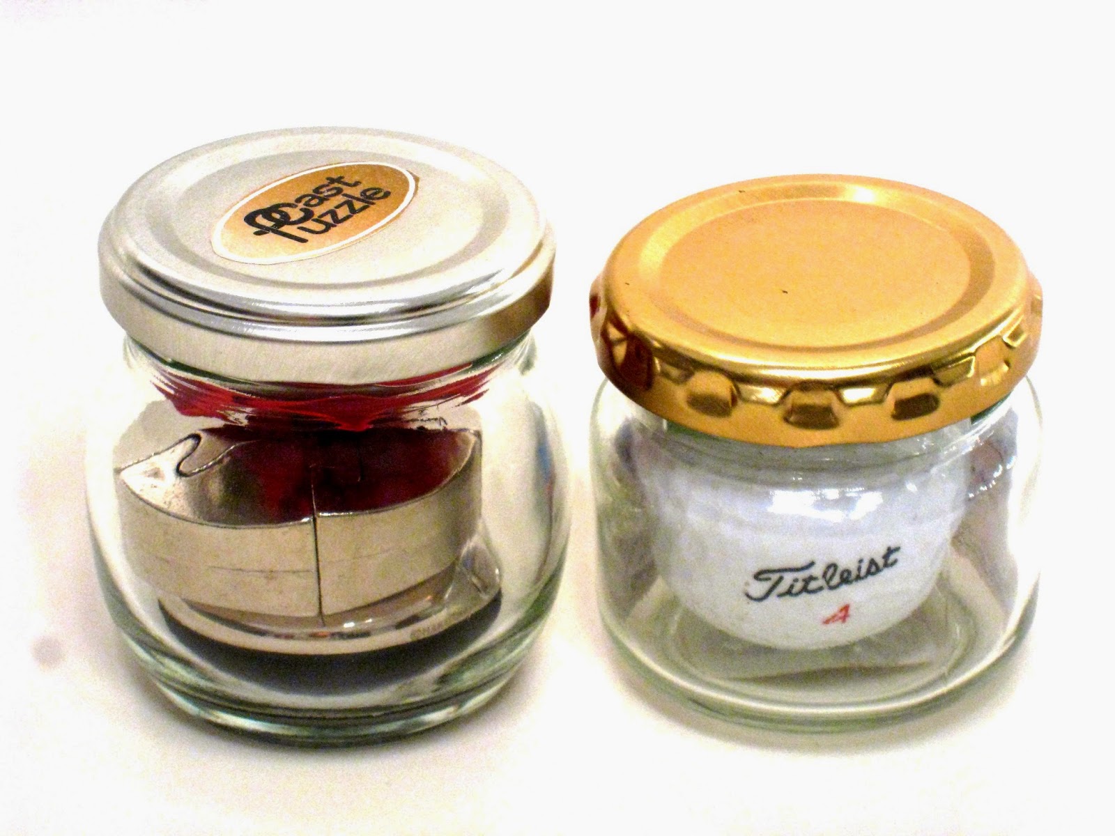 The jar contains two Hanayama Cast puzzles (Cast Spiral and Cast Loop) and a burgundy coloured origami rose. Its easy to remove the paper rose but it would take (a lot) of figuring out how to disassemble and remove both the Spiral and Loop, since it is impossible for them to pass through the mouth of the jar. I didn't attempt to solve this one; its difficult as it is already to solve the cast puzzles on their own outside of any jar!