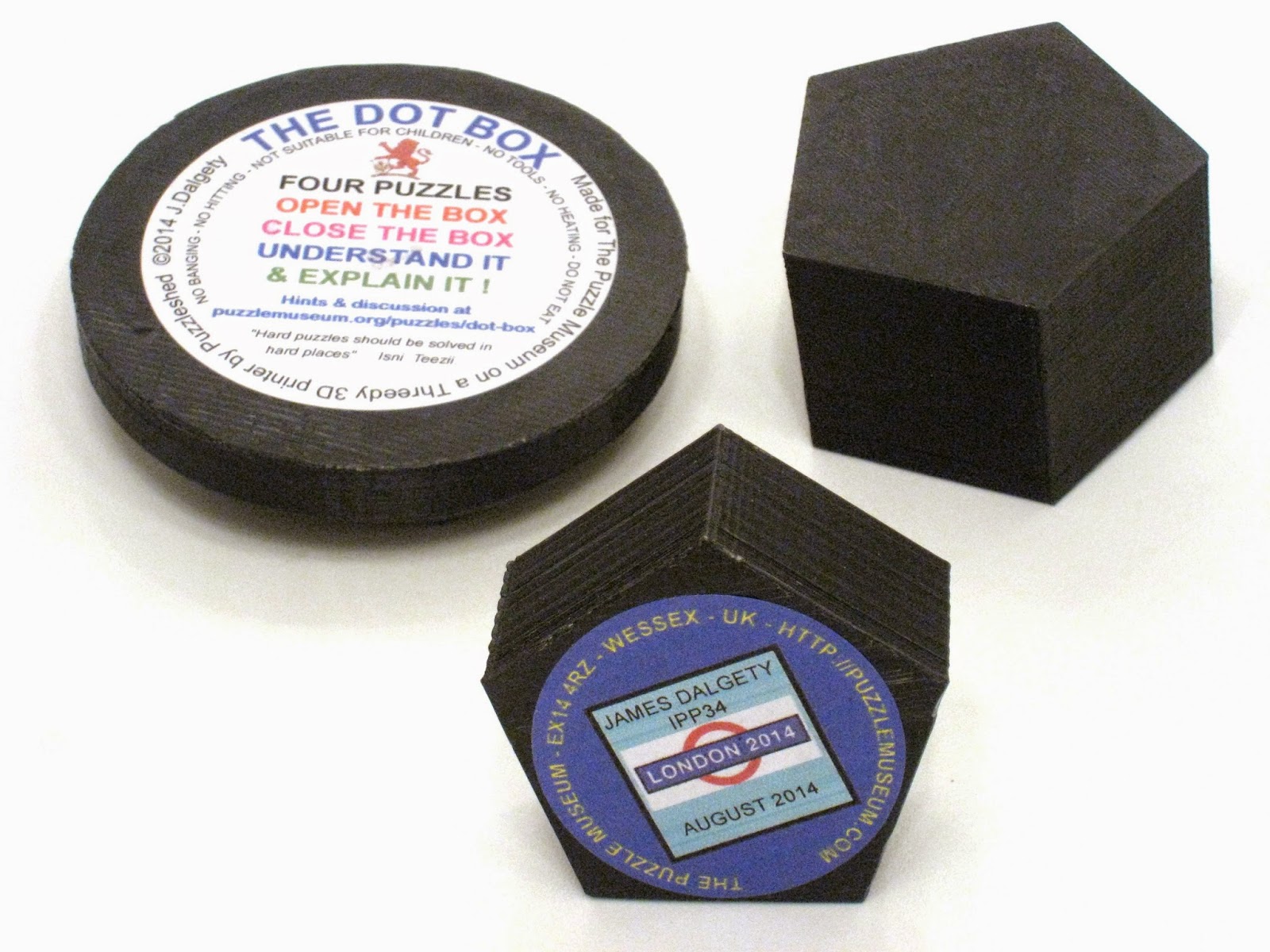 The Dot Box consists of a pentagonal box which sits into a base (called a plinth). The puzzle is 3D printed in ABS resin by Simon Bexfield and Steve Nicolls, the duo from Threedy 3D Printers. Quality is very good for a 3D creation and everything fits well together.