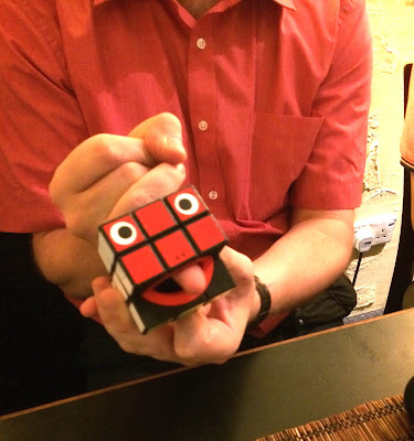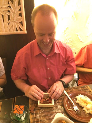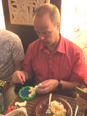 Everyone got round to playing with each other's puzzles especially the new ones from Oskar and even a couple of cubers tried their hand at Pit Khiam's and my non-twisty packing puzzles. Our table was full of loud and animated conversation. The other diners in the restaurant gave us bemused looks as we passed our toys around. We were in a world of our own! I kept hearing words like "parity", "algorithms" etc; twisty speak of course. The evening ended rather early to the disappointment of everyone...the restaurant was closing and the staff politely asked us come back another day!