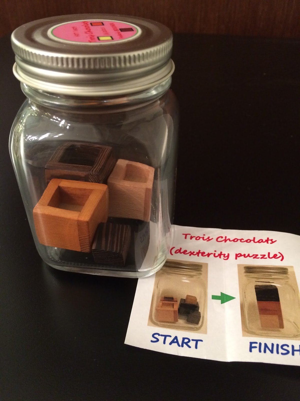 When I first looked at the puzzle, I thought it was going to be a really tough challenge given there are 4 pieces. And in the early stages I had some difficulty with all the cubes rolling around inside the jar. But as I puzzled on, turning the jar in all directions, it didn't appear as difficult as I had expected. I slowly got the hang of it. I could get the cherry onto the maple cube and with some persistence, the wenge thereafter. The part that was most difficult was to get the small block into the cavity of the wenge cube. This took me a good twenty minutes to get right and occasionally in between, the other 3 cubes would dislodge and I had to start all over again.
