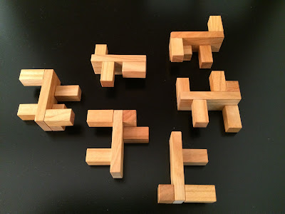 The first is the Hexator, a burr-shaped interlocking solid with 6 irregular pieces each made of different rectangular blocks glued together. Measuring about 5.5cm all round, this was Abel Garcia's exchange puzzle. Taking apart the Hexator was not to difficult once you find where the pieces connect and slide them apart. But the challenge came during the re-assembly. I didn't think it was going to be that difficult but the moment I scrambled the pieces, I wished I hadn't done so. While its only 6 pieces, the pieces are (almost) identical to each other but not so. They just look confusingly similar.