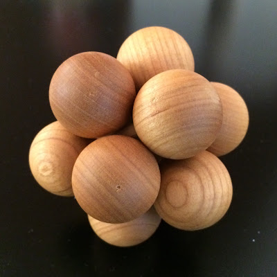 The next is Patrick Major's exchange puzzle, the Kissel, a puzzle comprising 4 identical pieces, each consisting of 3 balls joined together in an L-shape. In the solved state, the puzzle forms a symmetrical bunching of 12 balls. The overall size of the bunch is approximately 7cm all round with each ball about 2.7cm in diameter.